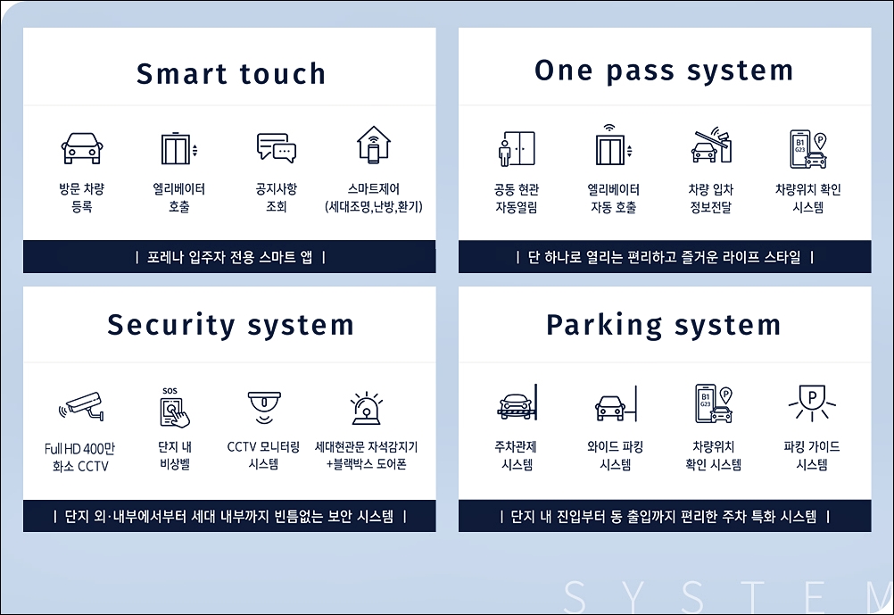 단지 내.외부에 조경 시설과 인테리어가 아주 웅장합니다. 브랜드 아파트 단지답게 보안시설에 아주 특화되어 있는 모습인데요. 특히 차량위치 확인 시스템과 와이드파킹 시스템은 일반적인 비브랜드 아파트에서는 볼수없는 시설이라 유심히볼 가치가 있습니다.