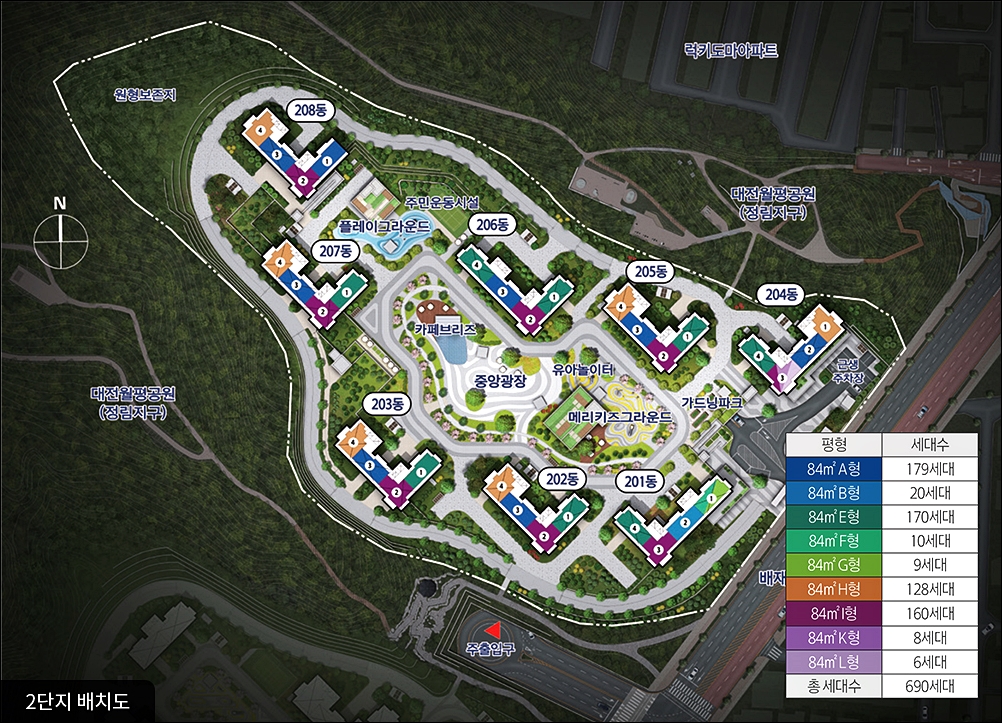 해당 단지는 총 1349세대로 구성되어 있습니다. 1단지 2단지로 구분되어 있으며 전체 전용 84타입 으로 구성되어 있습니다. 위치는 1단지 대전광역시 서구 정림동 산 23-21 / 2단지 대전광역시 서구 도마동 산 39-1 입니다.