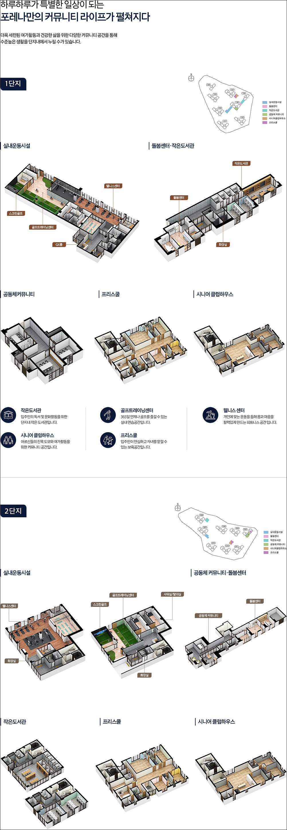 한화포레나 브랜드 단지 답게 커뮤니티 시설이 아주 잘되어 있습니다. 실내운동시설, 돌봄센터, 작은도서관, 프리스쿨, 시니어클럽하우스 등이 구성되어 있습니다. 여기에 월평공원 산책로 까지 영구적으로 사용가능한 커뮤니티 시설 이라고 보아도 무방할것 같습니다.