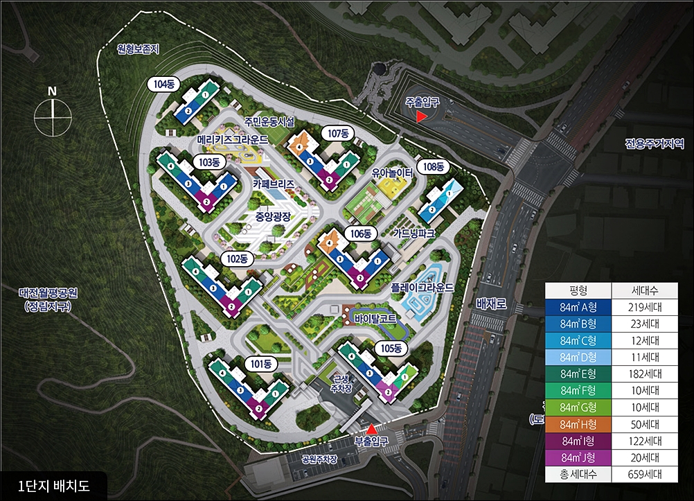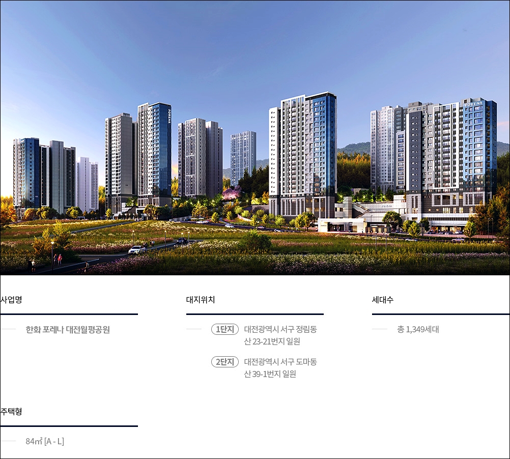 해당 단지는 총 1349세대로 구성되어 있습니다. 1단지 2단지로 구분되어 있으며 전체 전용 84타입 으로 구성되어 있습니다. 위치는 1단지 대전광역시 서구 정림동 산 23-21 / 2단지 대전광역시 서구 도마동 산 39-1 입니다.