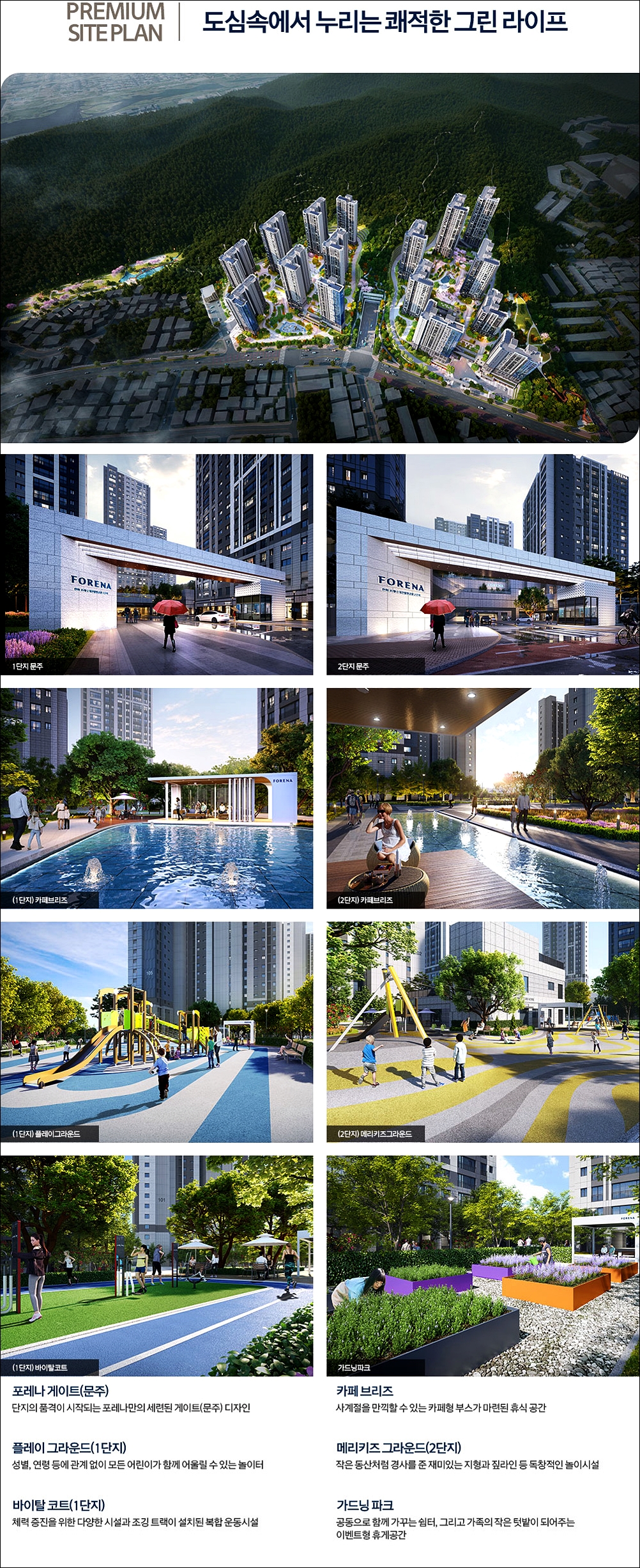 한화포레나 브랜드 단지 답게 커뮤니티 시설이 아주 잘되어 있습니다. 실내운동시설, 돌봄센터, 작은도서관, 프리스쿨, 시니어클럽하우스 등이 구성되어 있습니다. 여기에 월평공원 산책로 까지 영구적으로 사용가능한 커뮤니티 시설 이라고 보아도 무방할것 같습니다.