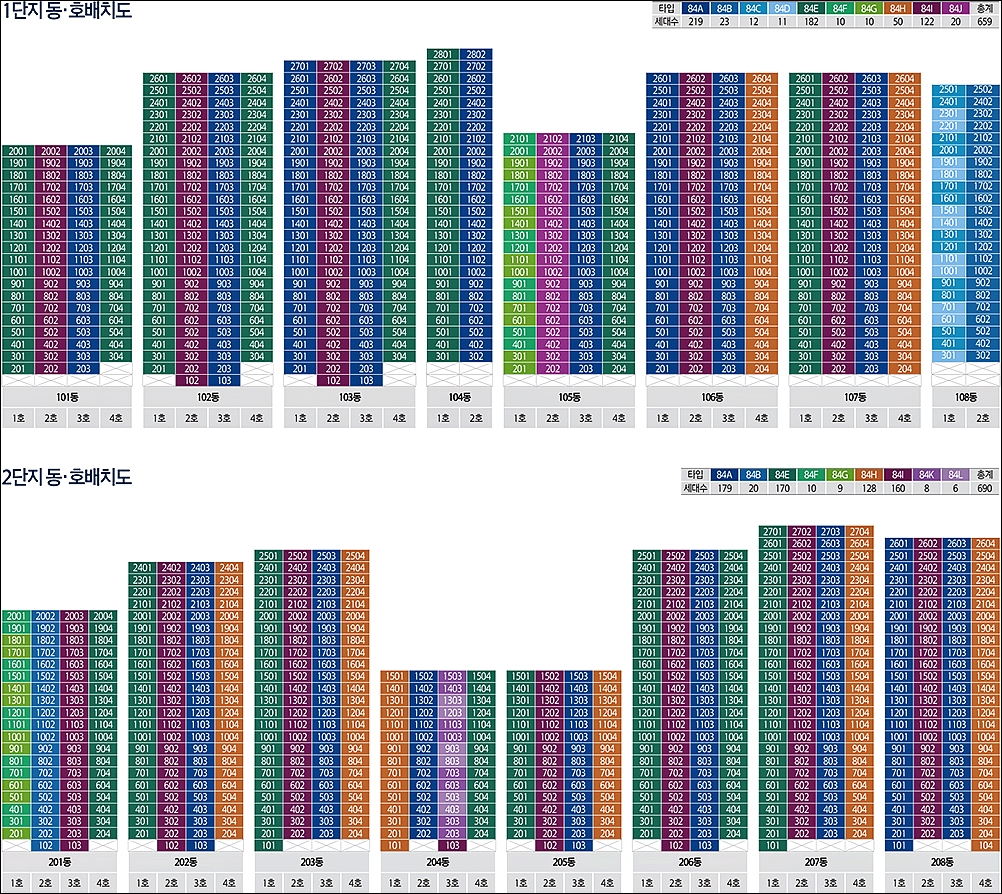1단지는 총 8개동 으로 구성되어 있습니다. 단지 배치도를 확인 해보시면 동간 거리는 나름 여유가 있는 편입니다. 전체 세대수는 659세대 입니다. 2단지 역시 총 8개동 입니다. 2단지 세대수는 690세대 입니다.