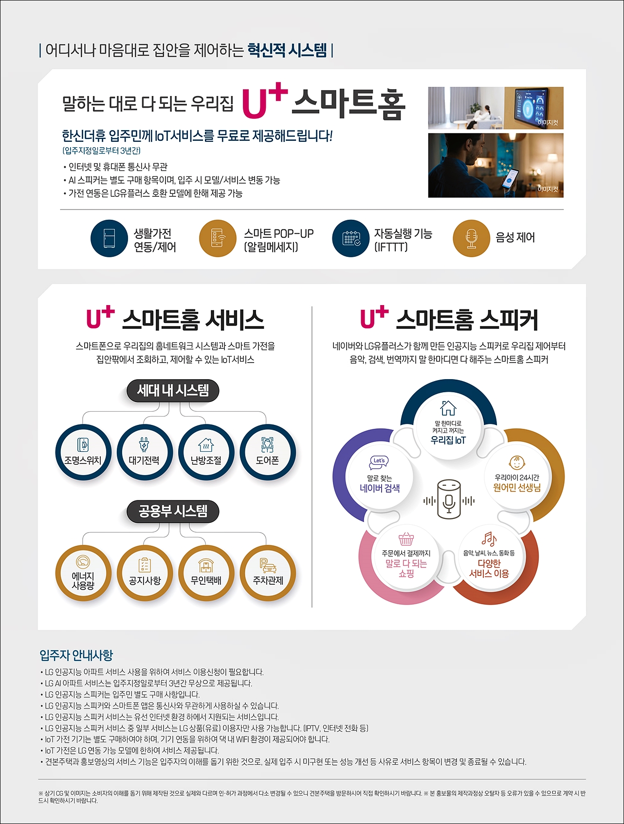 요즘 많이 이슈가 되는 미세먼지, 황사 등을 대비한 환기 시스템도 눈에 띕니다. 엘리베이터 공기살균 시스템, 미세먼지 신호등, 전열교환기 시스템 등이 설치되어있고 지하주차장 내 전기차 충전소 또한 넉넉하게 배치되어 있습니다. 여기에 U+ 스마트홈 시스템으로 언제 어디서든 집안 곳곳을 내가 스스로 전력차단 및 냉.난방 차단을 할수가 있습니다.