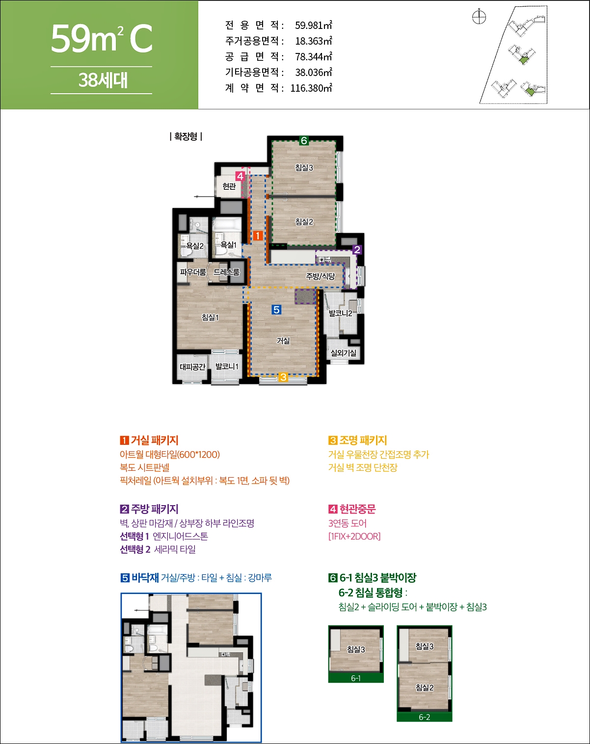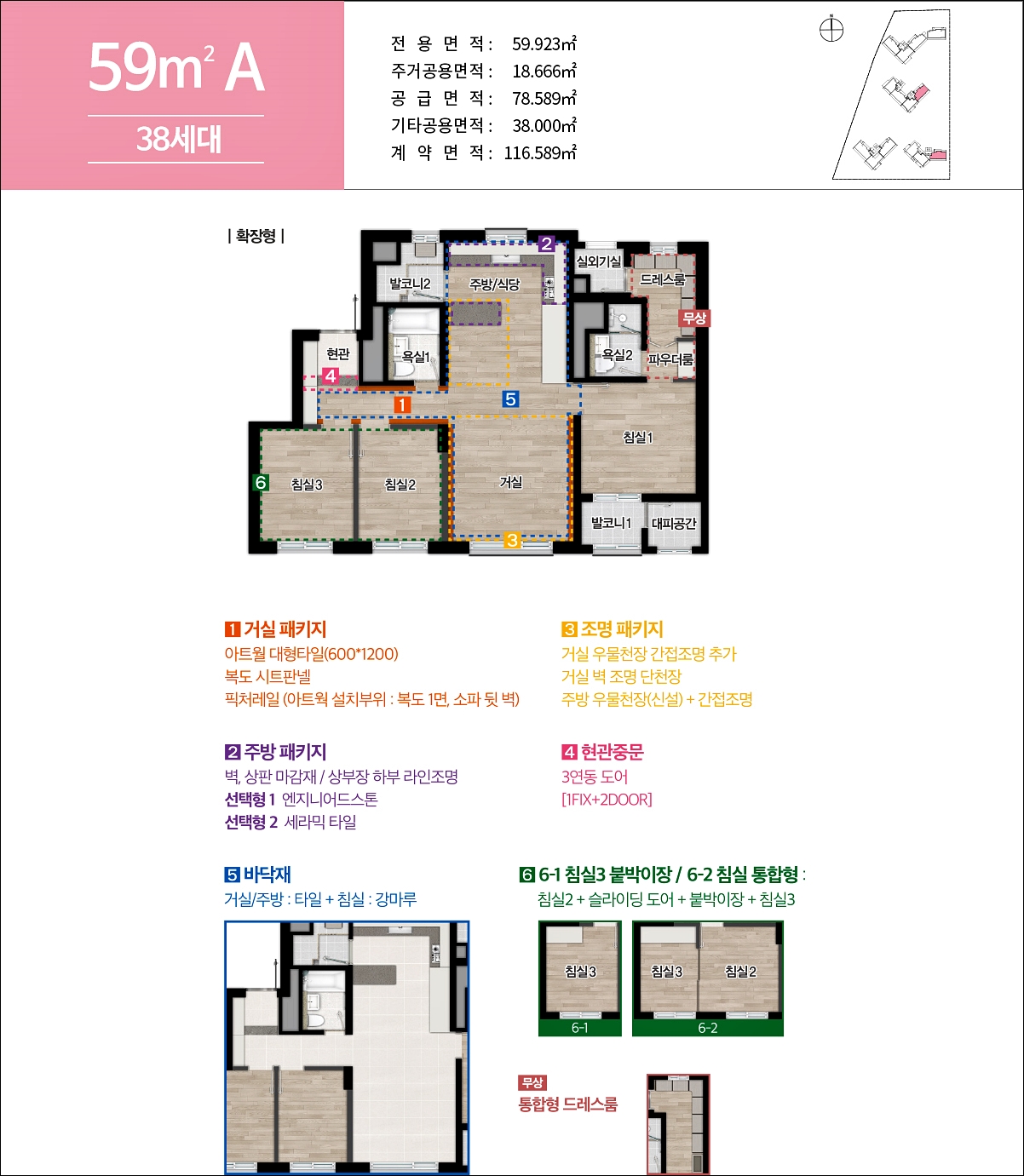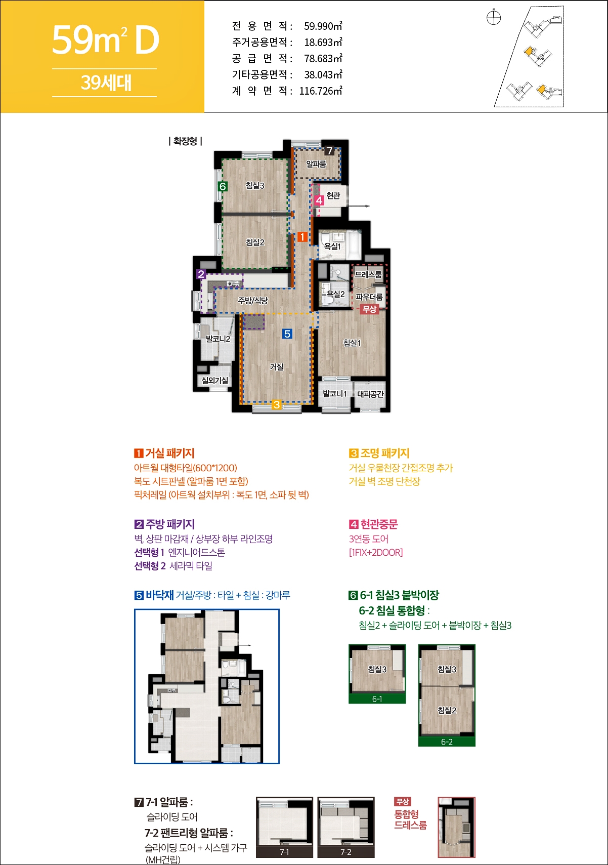 59C 타입은 타워형 구조 입니다. 거실패키지 옵션을 추가하시면 거실벽 대형아트월 타일이 시공되고, 복도에 벽지가 아닌 시트판넬이 설치가 됩니다.