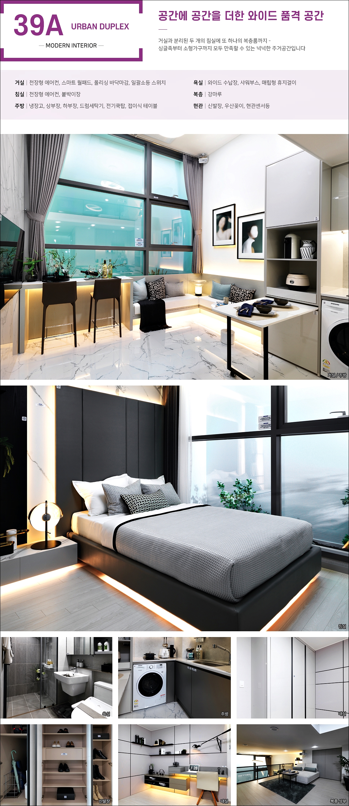 복층의 경우 강마루가 시공되었으며 풀퍼니시드 시스템을 통해 살림이 준비되지 않은 세대에서도 흔한