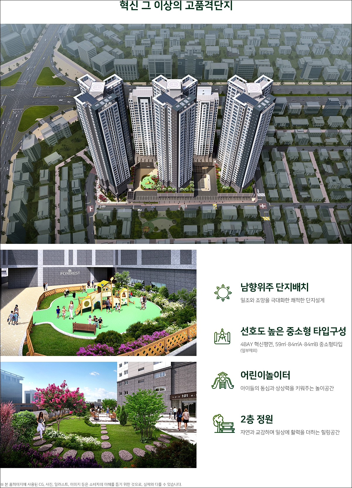 단지를 감싸고 있는 녹색 정원을 통해 도심 속에서도 숲의 향기를 느낄 수 있는 녹색 라이프를 누릴 수 있습니다.