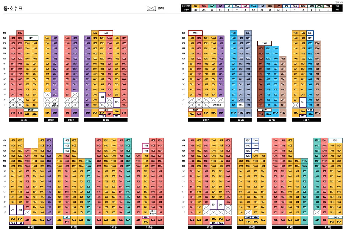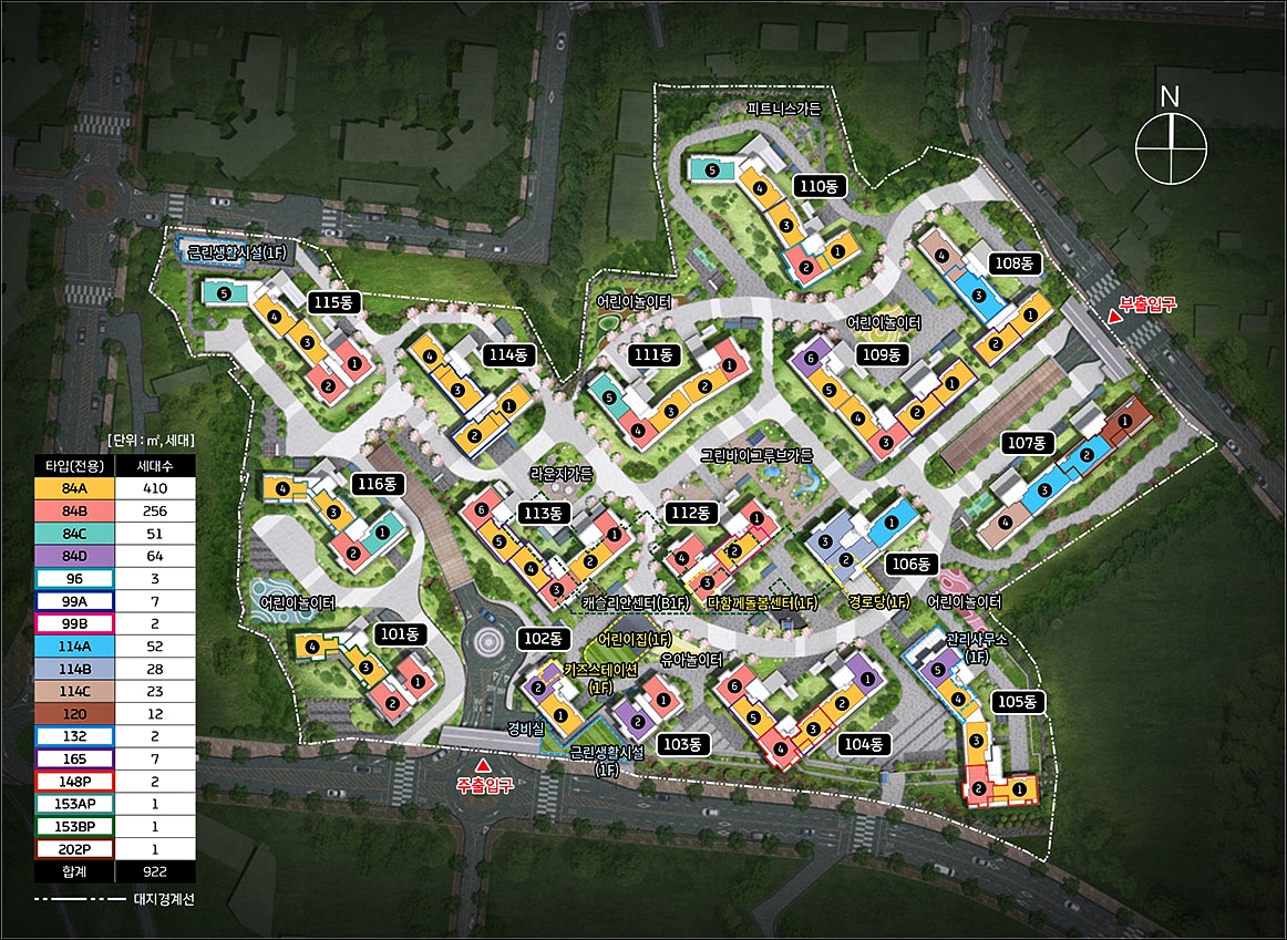 총 세대수는 922세대이며 16개의 동으로 구성되어 있습니다. 최고층수는 15층으로 이루어져 있습니다.