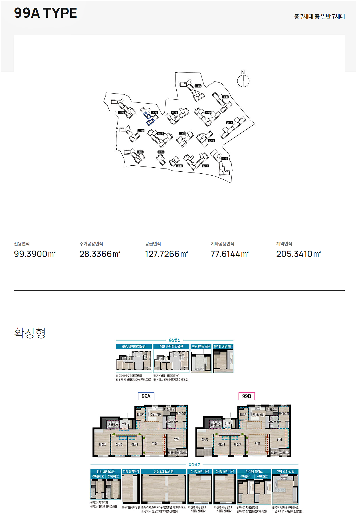 99A타입은 7세대를 분양합니다. 방이 총 4개이며 5베에로 구성되어 있습니다.