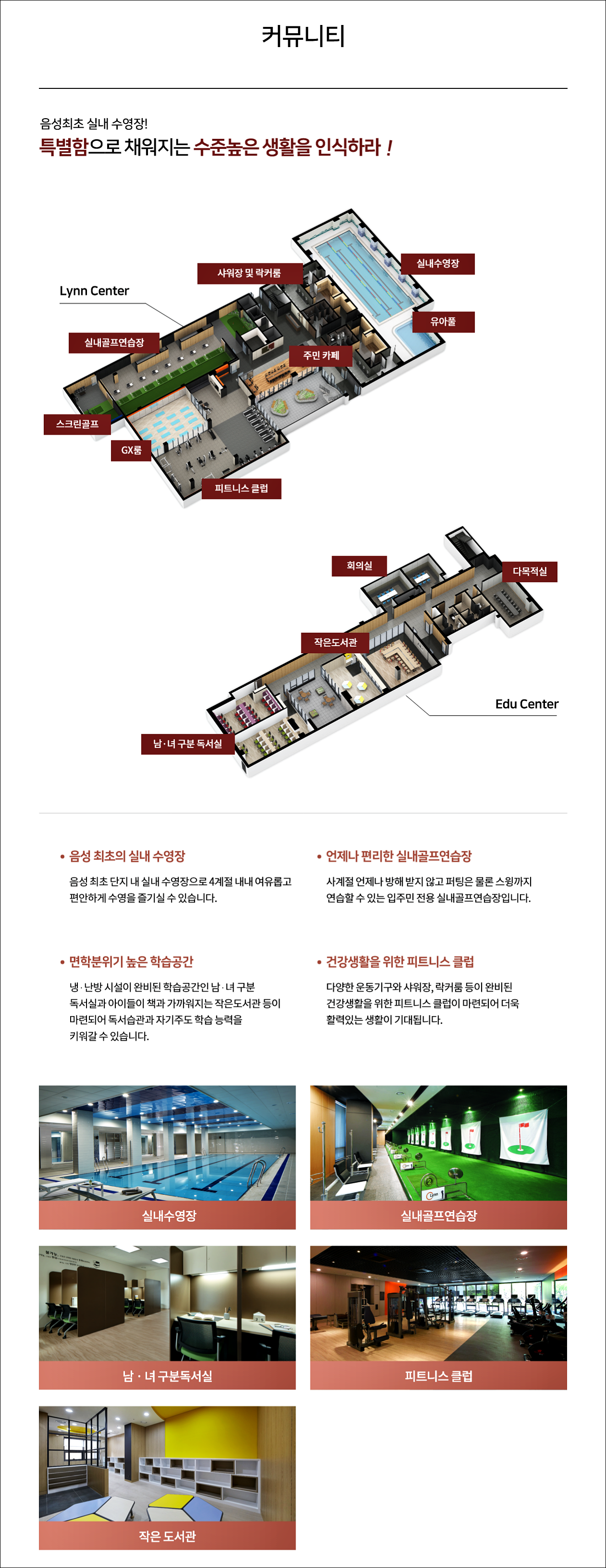 4계절 내내 이용할 수 있는 음성 최초의 실내 수영장과 실내골프연습장, 피트니스클럽을 통해 단지 내에서 충분한 레저, 레크리에이션을 즐길 수 있으며 남녀구분 단지내 독서실과 작은 도서관 운영으로 면학 분위기 조성이 가능합니다.