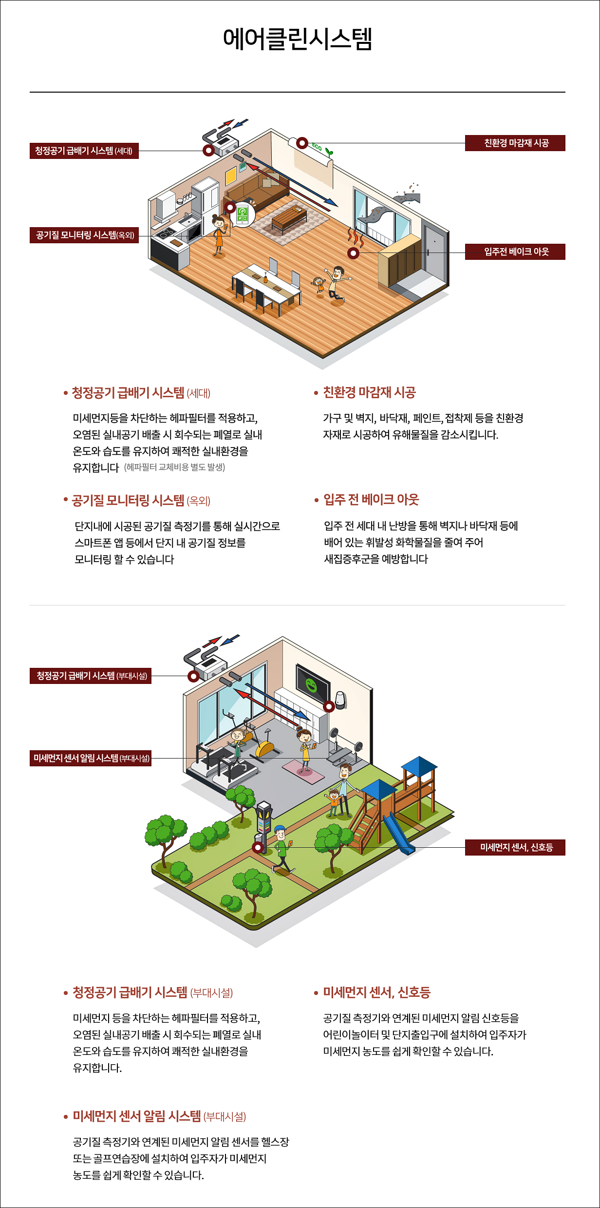 공기 질 모니터링 시스템을 통해 실시간 스마트폰 앱을 통한 단지 내 공기 질 정보를 모니터링 할 수 있으며 세대에서는 청정공기 급·배기 시스템으로 미세먼지는 헤파필터를 통해 걸러내고 살균된 깨끗한 공기만 공급하여 위생적이고 쾌적한 환경을 제공합니다.