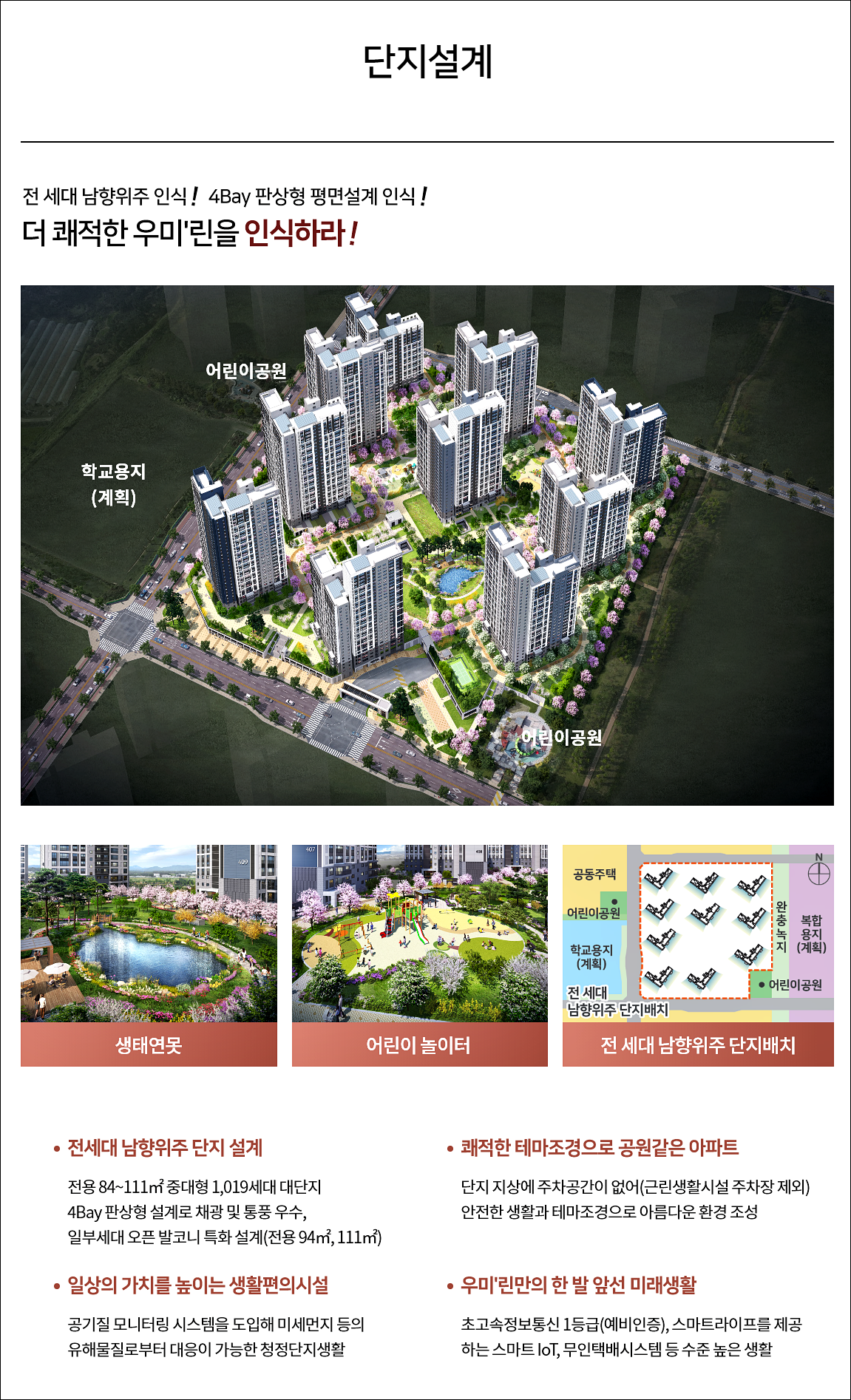 전 세대가 남향 위주로 설계되어 있으며 4베이 판상형 설계를 통해 풍부한 채광과 우수한 통풍을 자랑합니다.