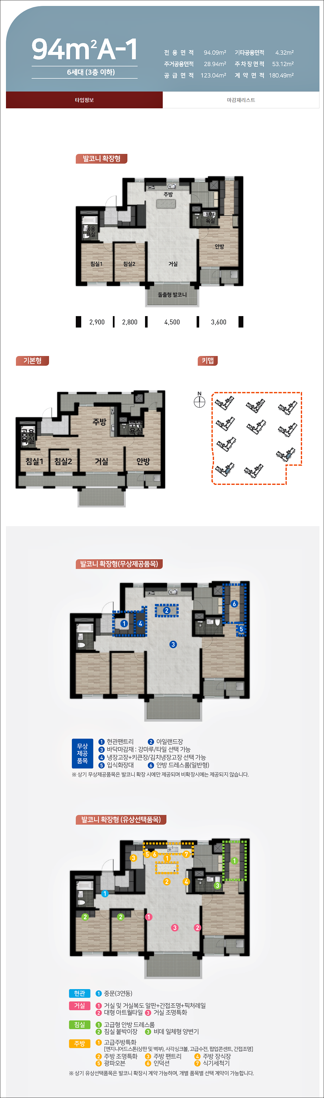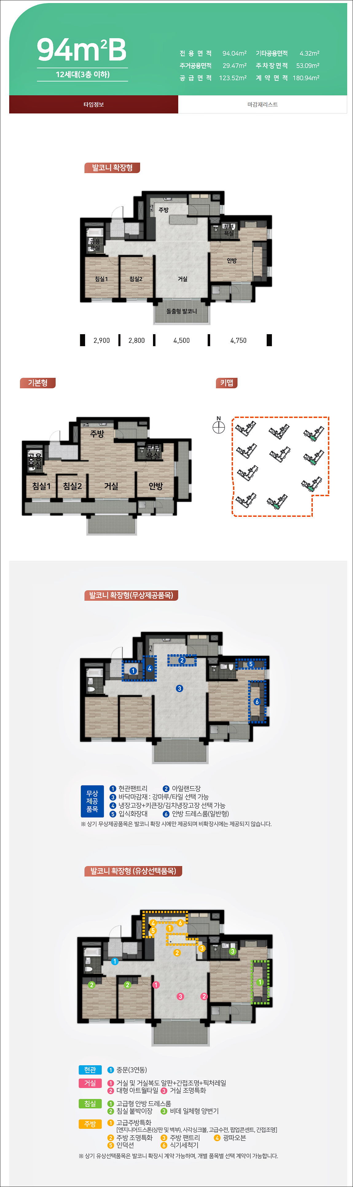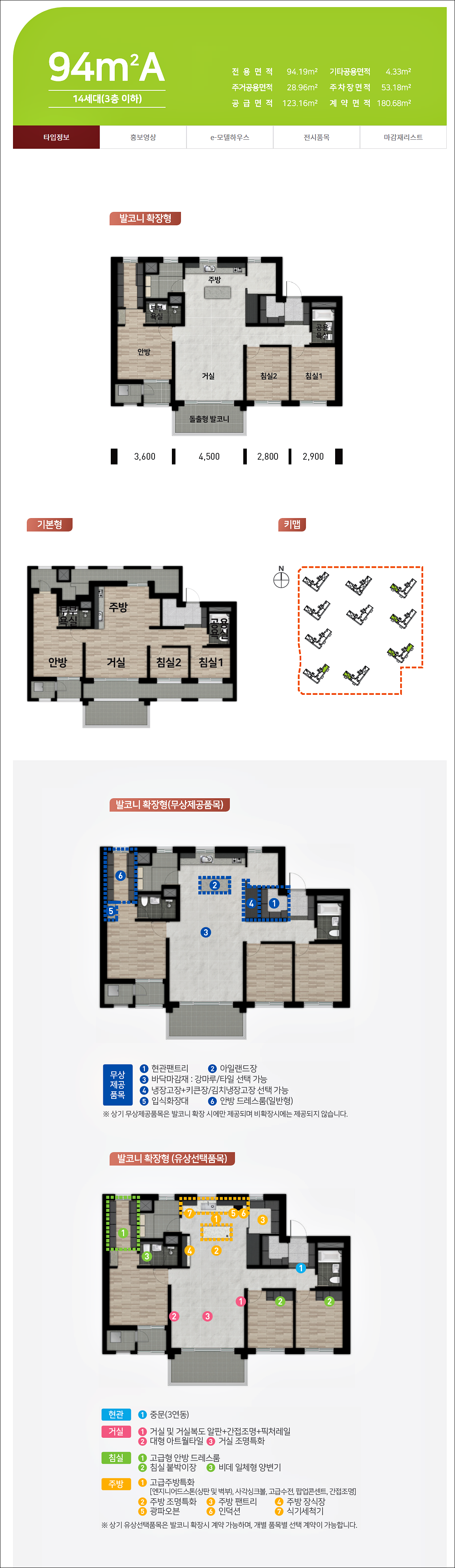 94㎡의 경우 더욱 넓은 거실구조가 눈에 띄며 현관 팬트리, 아일랜드장, 냉장고장, 김치냉장고장, 입식화장대, 안방 드레스룸 등이 무상으로 제공되는 파격적인 조건을 보여줍니다.
