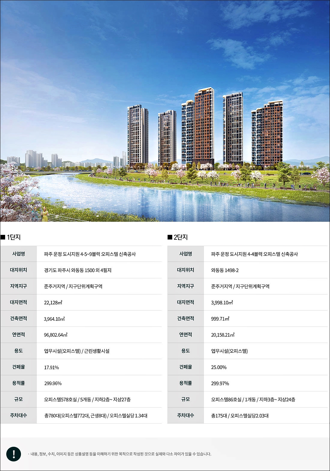 1단지와 2단지 2개 단지로 분리되어있으며 1단지는 주거용 오피스텔 578호실이 건축되며 전체 5개 동에 지하 2층 ~ 지상 27층까지 설계가 됩니다.