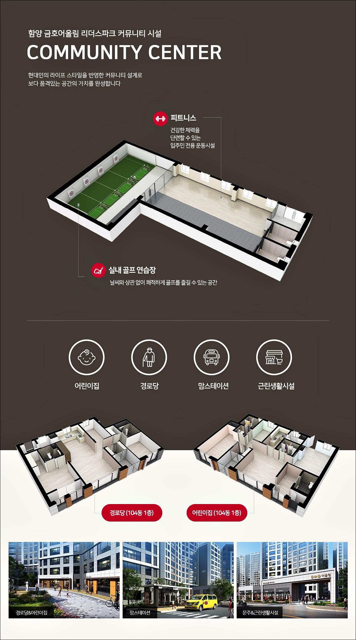 어린이집, 경로당, 맘스테이션, 실내골프연습장, 피트니스장 등 많이 사용하는 시설위주로만 설계되었습니다.