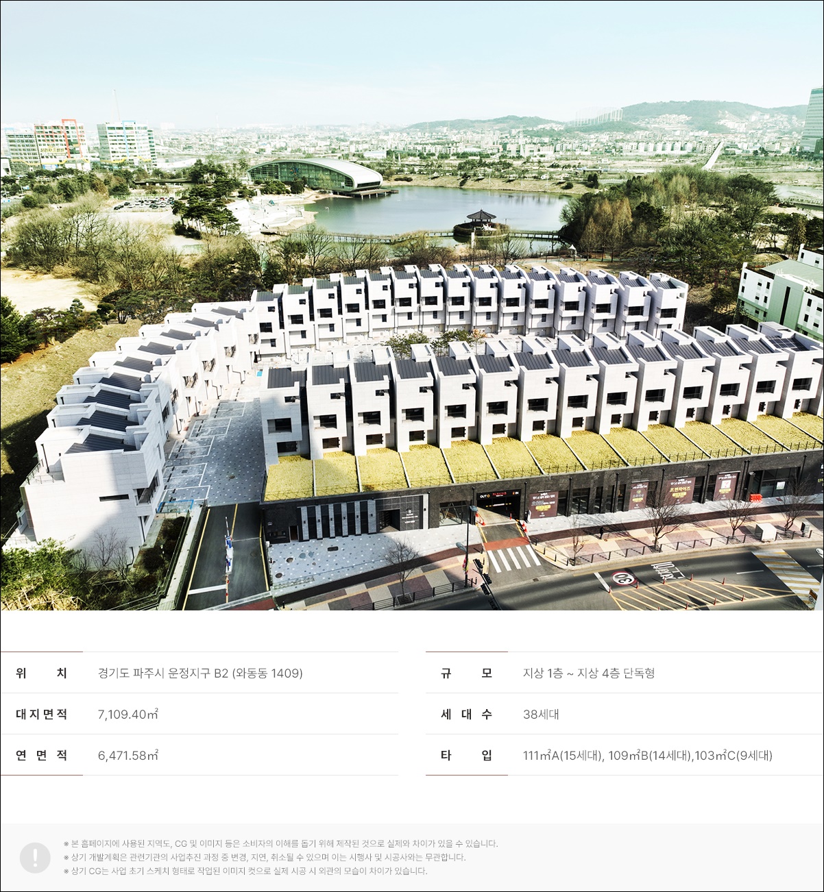 운정호수공원을 품고있는 단독형 타운하우스 주택으로 파주 운정신도시 내에서 굉장히 희소성이 있을것 같습니다.