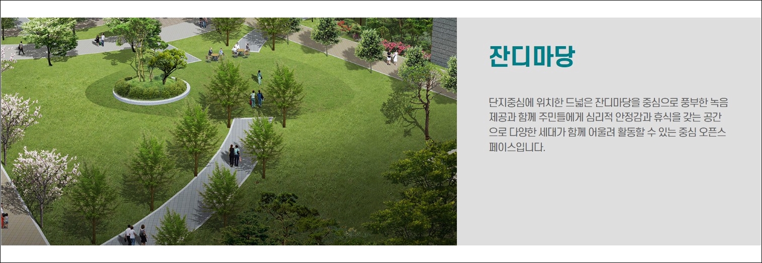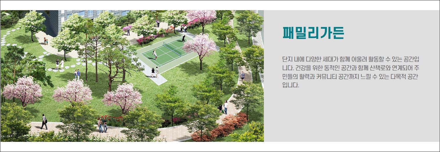패밀리가든, 잔디마당, 유아놀이터 등 조경면적이 아주 넓으며 동간 거리가 넓어 쾌적한 생활이 가능할것으로 보입니다.