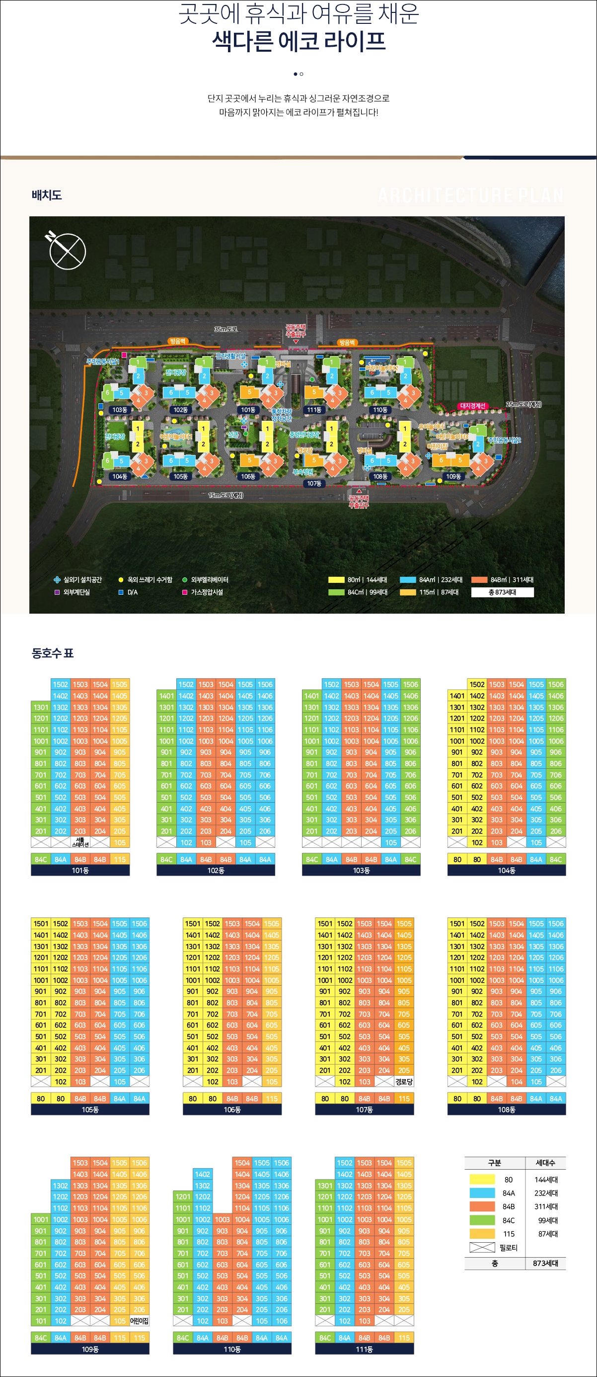 총 873세대를 공급할 예정이며 최소 타입은 80부터 시작하기 때문에 소형평수보다는 중대형 위주로 구성됩니다.