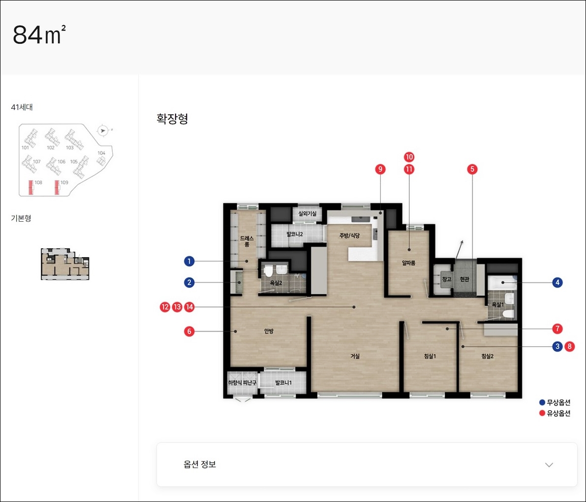 84타입은 41세대 공급 예정입니다. 방 3개에 알파룸까지 제공됩니다.