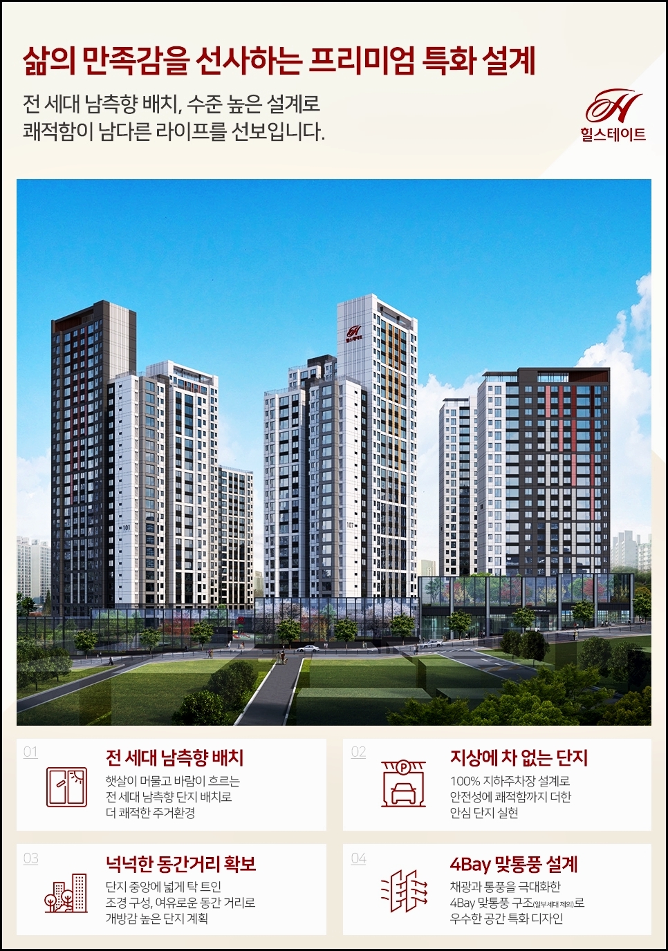 해당 단지는 현대건설 시공 힐스테이트 브랜드를 가지고 있으며 4 BAY 판상형 구조로 설계가 되었습니다.