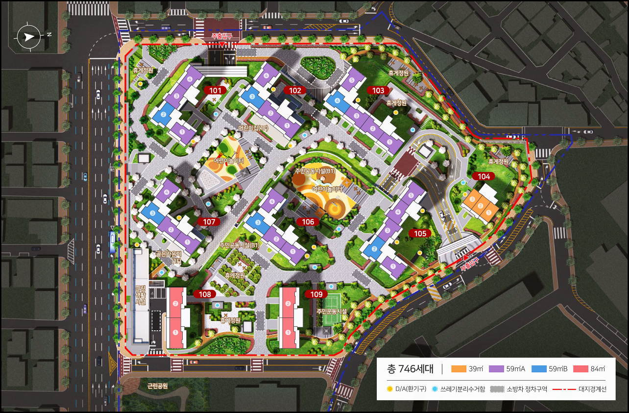 때문에 단지 자체가 쾌적하고 답답하지 않아 보인다는 장점이 있습니다.