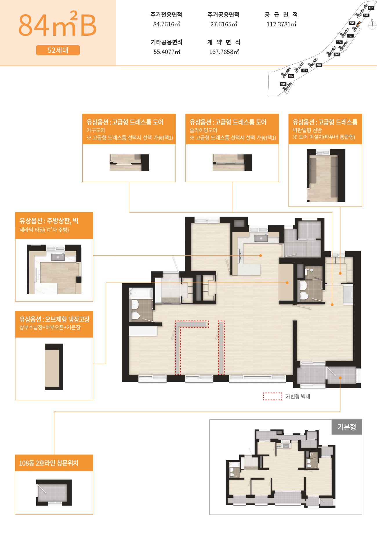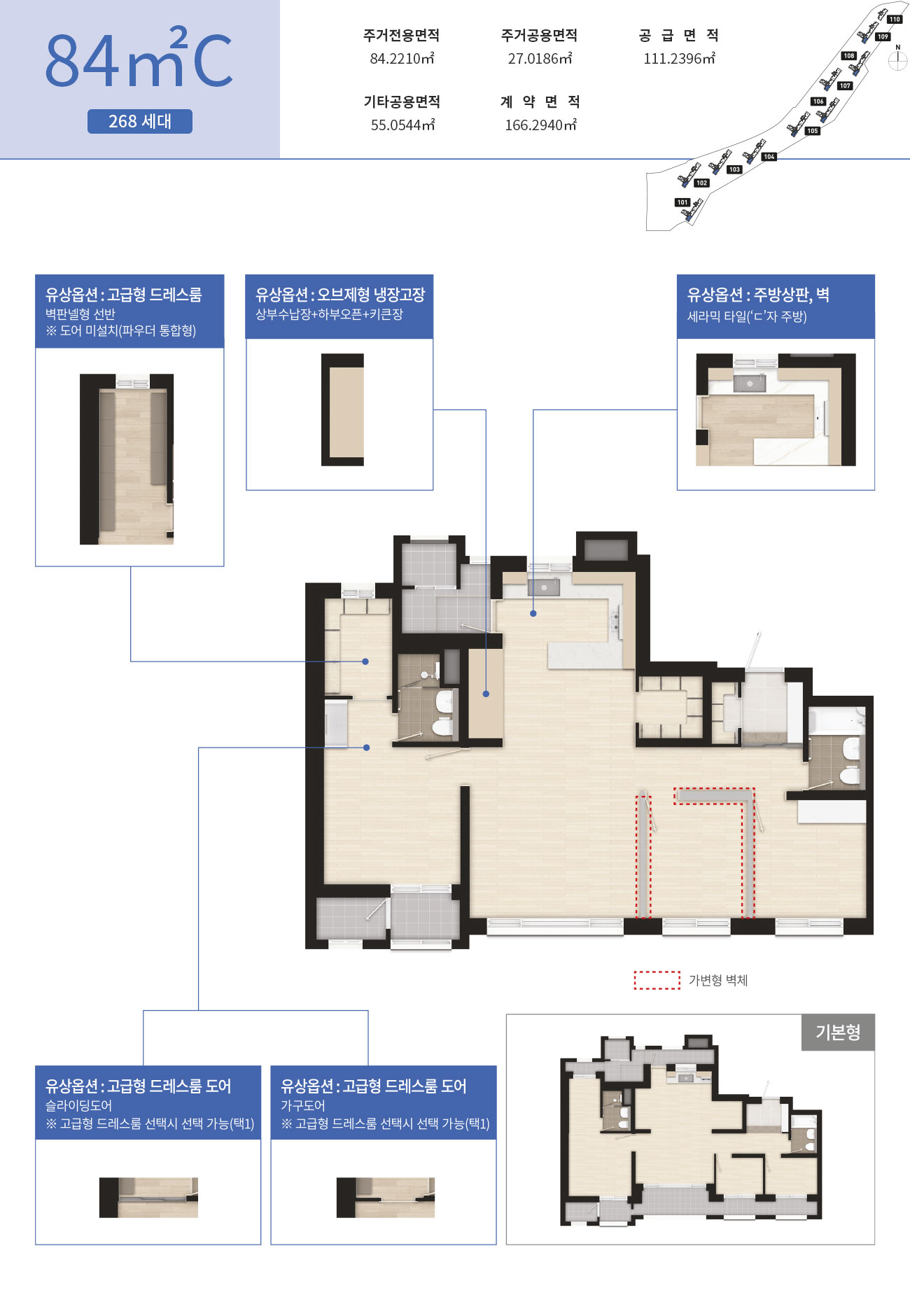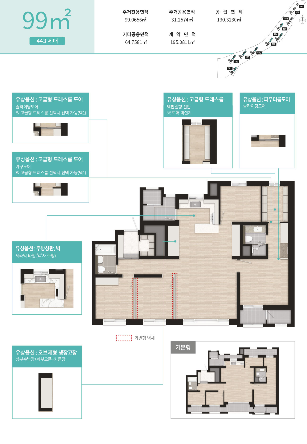 가변형 벽체를 활용해 소비자의 라이프 스타일에 따라 다양한 공간 연출이 가능하고, 전용 84타입은 주방 팬트리 등 넉넉한 수납공간을 제공하며, 99타입은 드레스룸, 수납장 일체형 파우더장, 알파룸 등을 통해 공간 활용도가 굉장히 좋습니다.