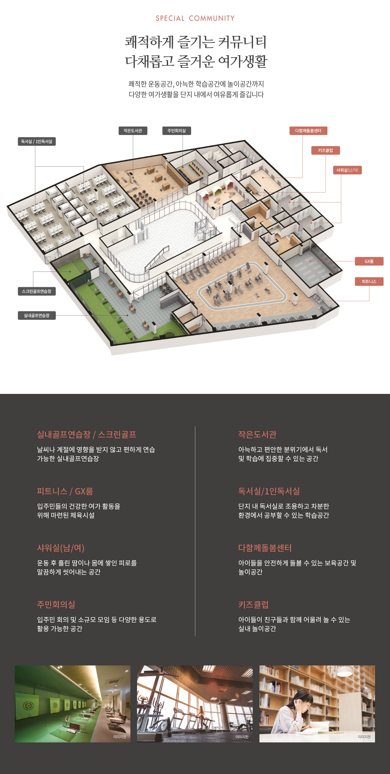 커뮤니티시설에는 피트니스클럽, GX룸, 실내골프장 등 체육시설을 비롯해 1인독서실, 독서실, 작은도서관, 주민회의실, 키즈클럽, 다함께돌봄센터 등이 마련돼 입주민들의 건강하고 여유로운 생활을 보장하고 있습니다.