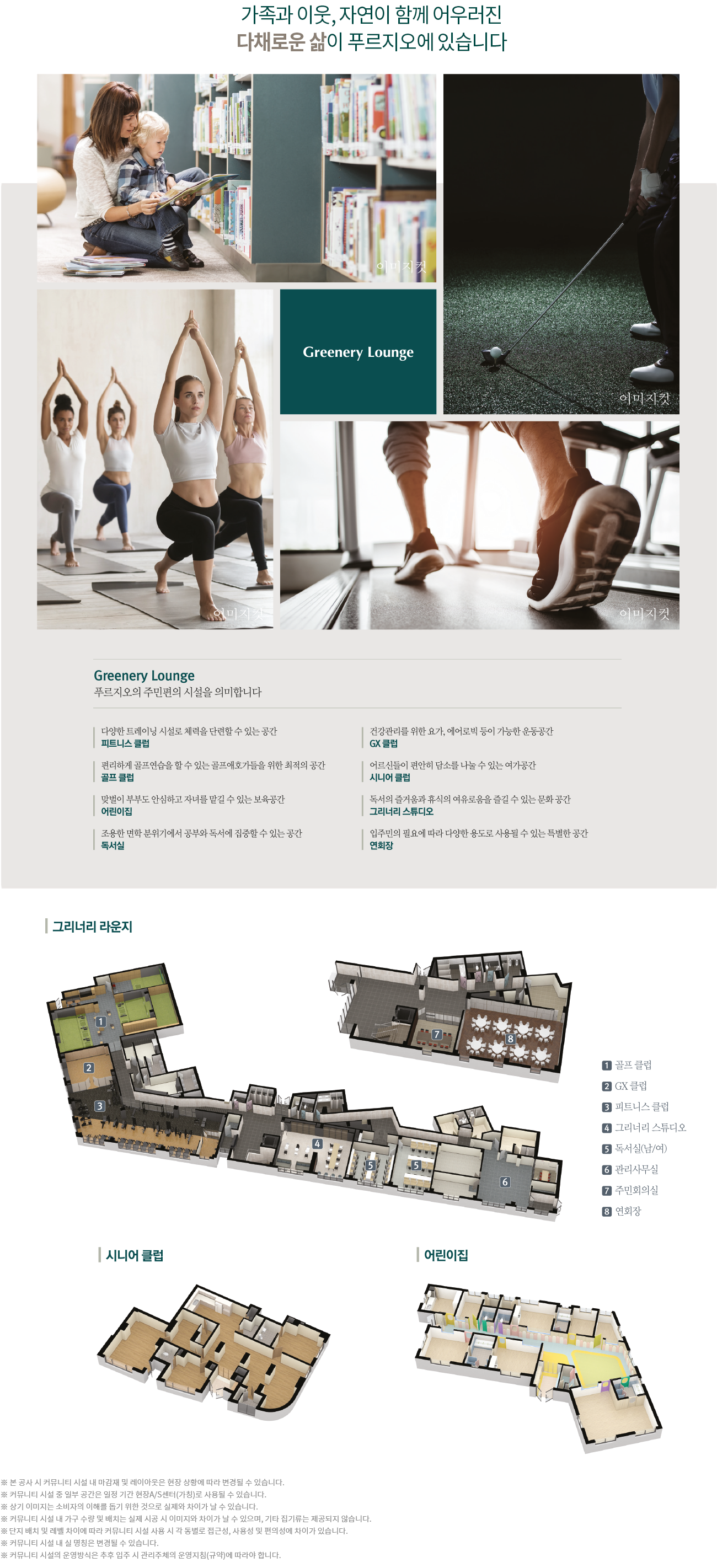 단지 내부에는 어린이집, 시니어클럽, 골프, 피트니스실 등 여러가지 커뮤니티 시설들이 들어설 예정 입니다.