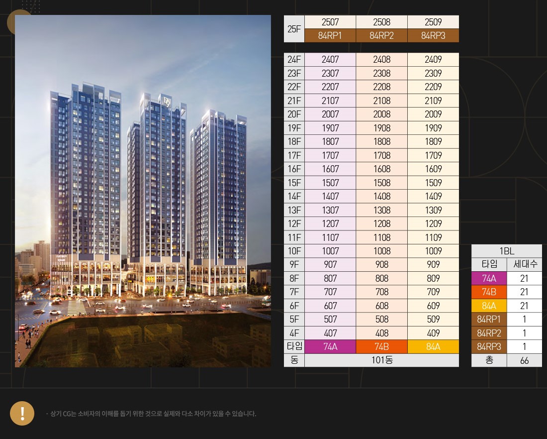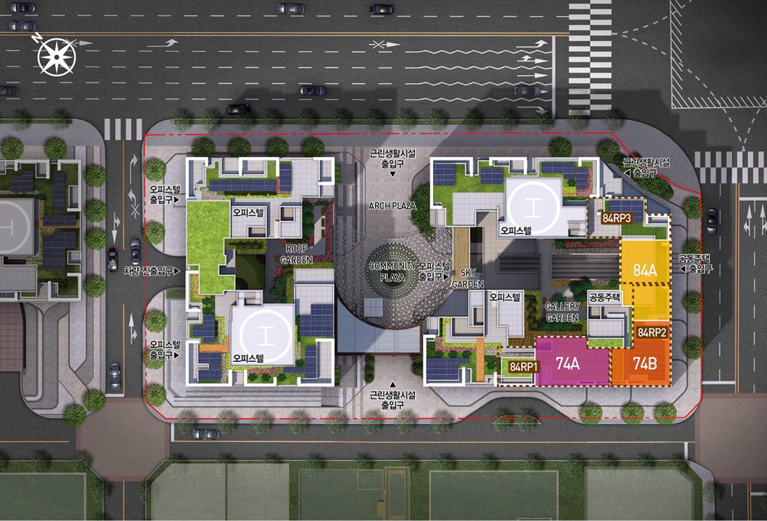 총 2개 블럭에 540세대로 구성되고 주거용 오피스텔 474세대와 아파트 66세대중, 주거용 오피스텔은 분양이 모두 끝났고 아파트 66세대는 후분양 으로 진행하고 있습니다.