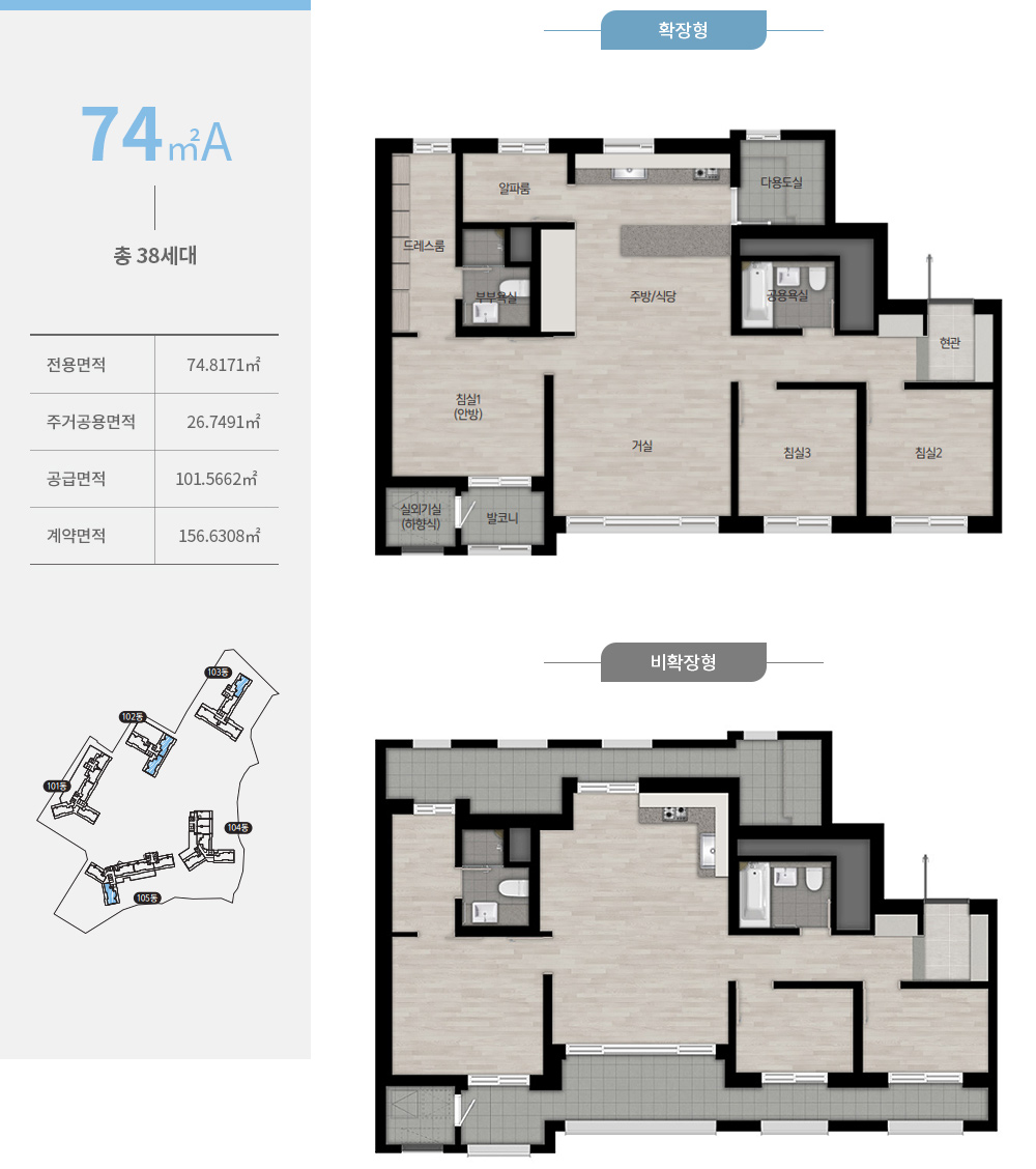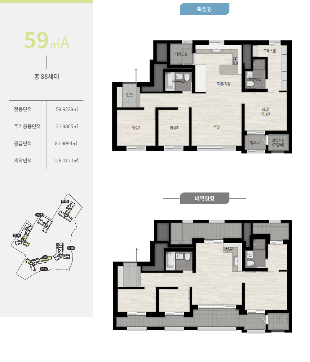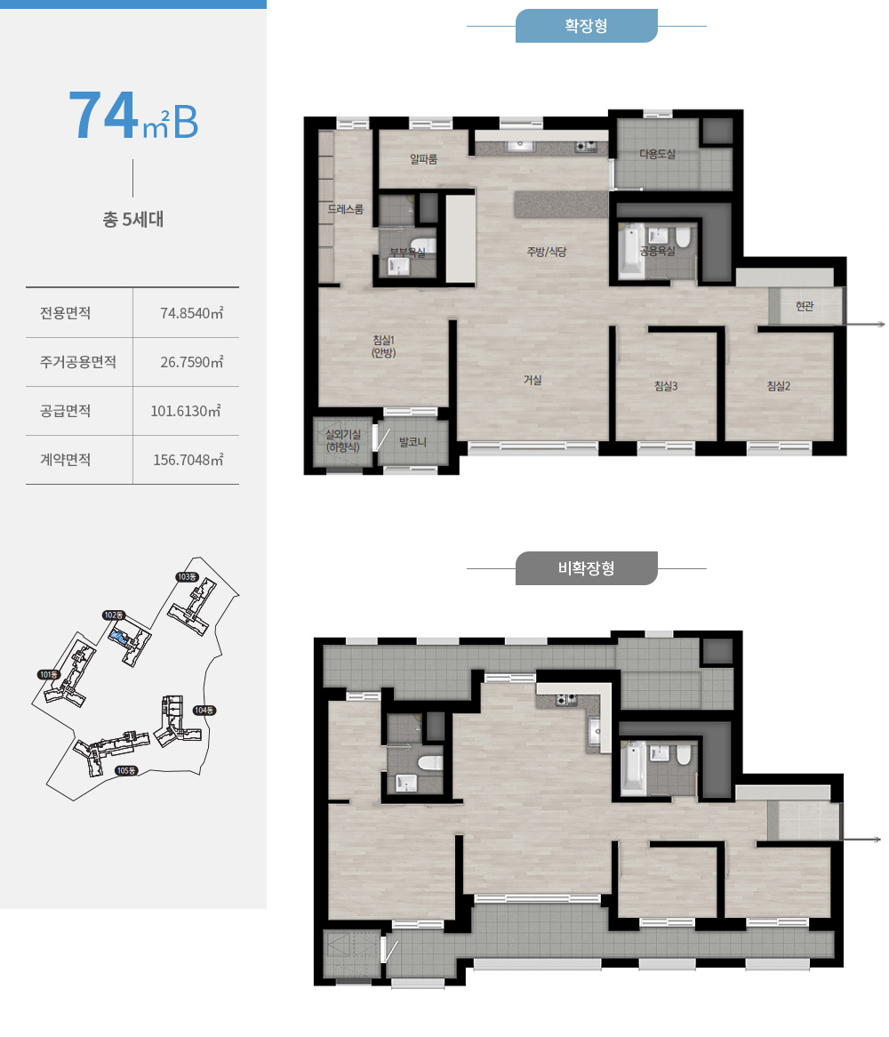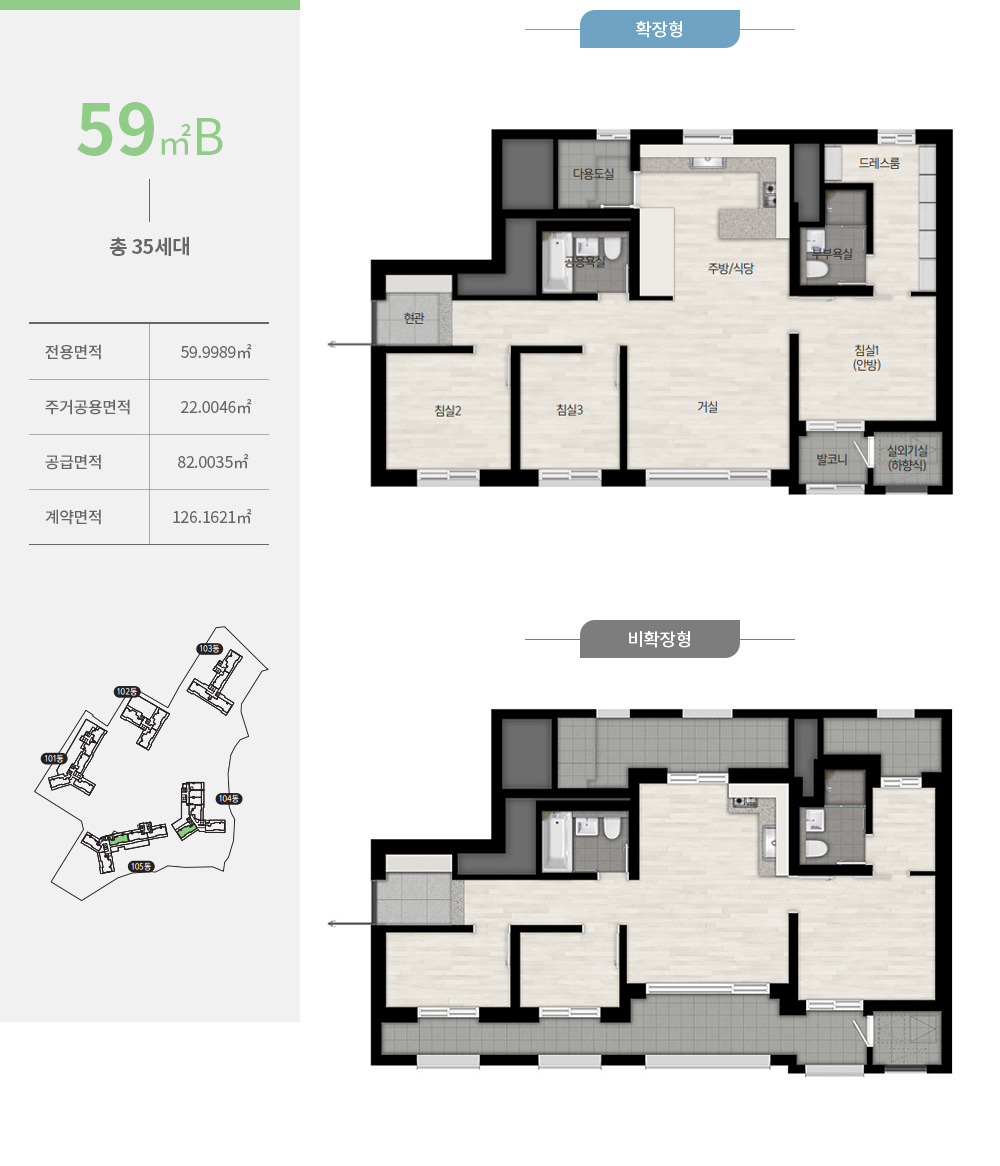 확장 시 전망강화형 유리난간창이 설치되며, 다용도실은 세탁기와 건조기를 병렬로 배치할 수 있도록 넓은 공간을 확보했습니다.