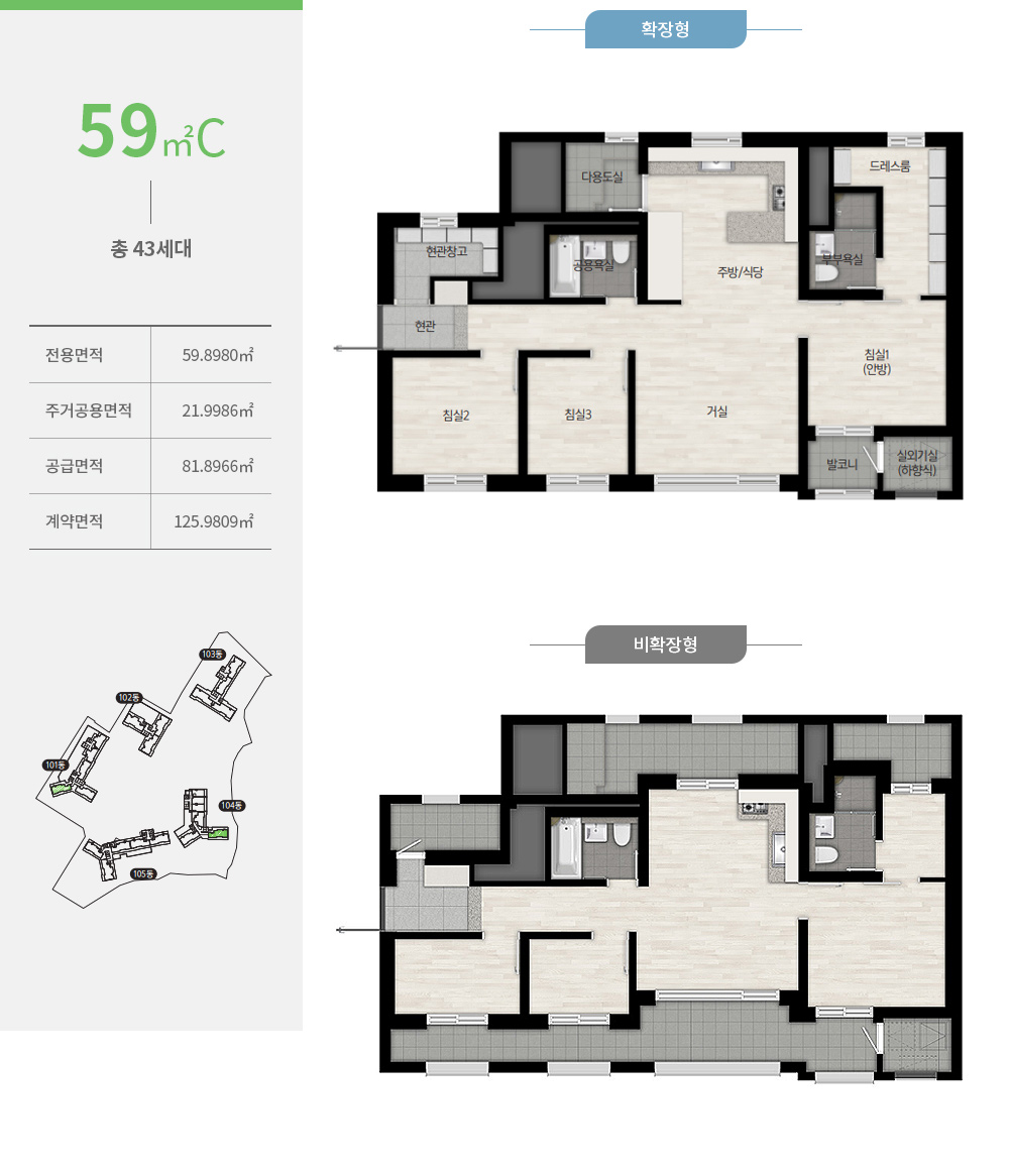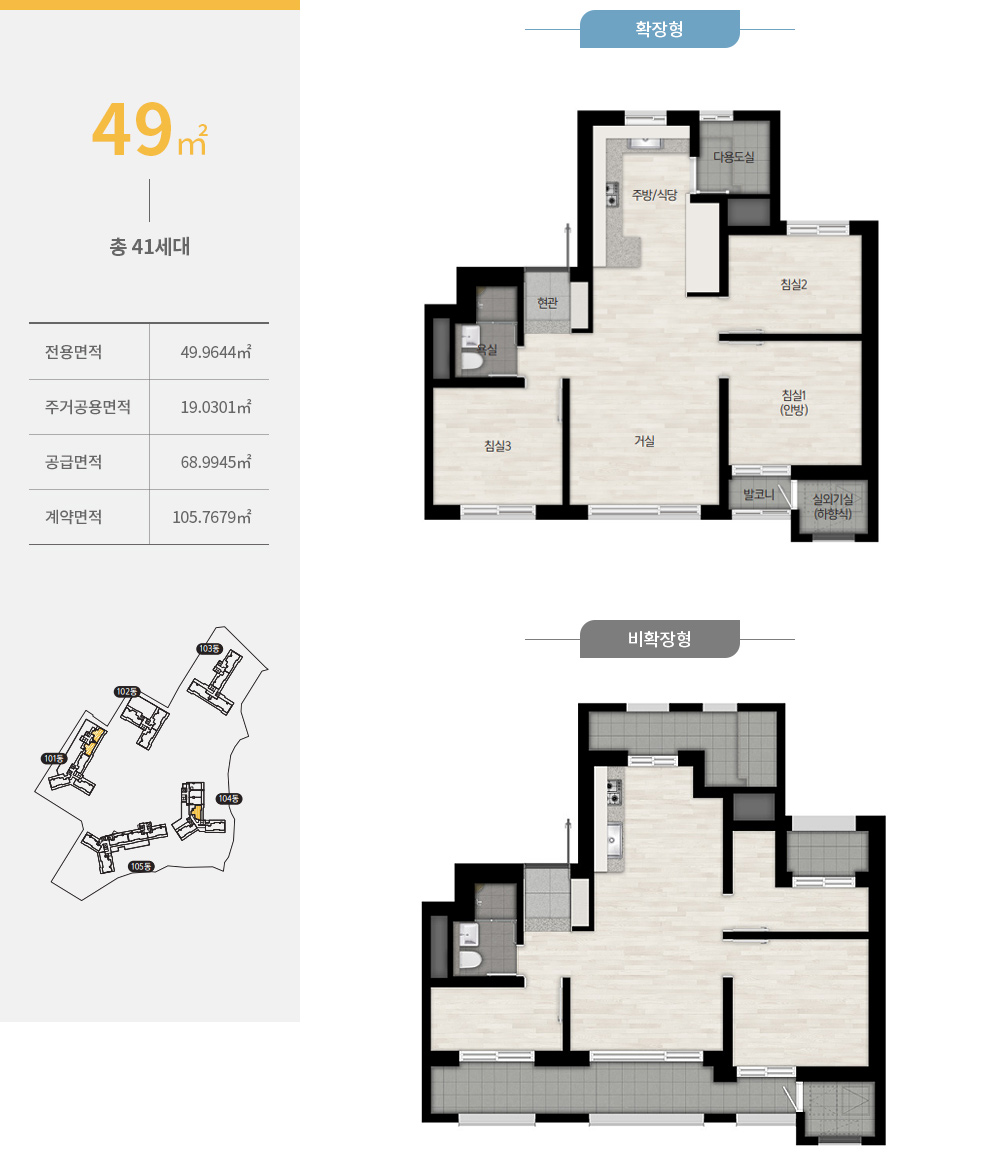 전 타입 판상형 4베이(Bay) 위주 설계가 적용돼 공간활용도를 높였고, 49타입의 경우는 소형이지만 3베이 구조를 적용해 면적을 극대화했습니다.