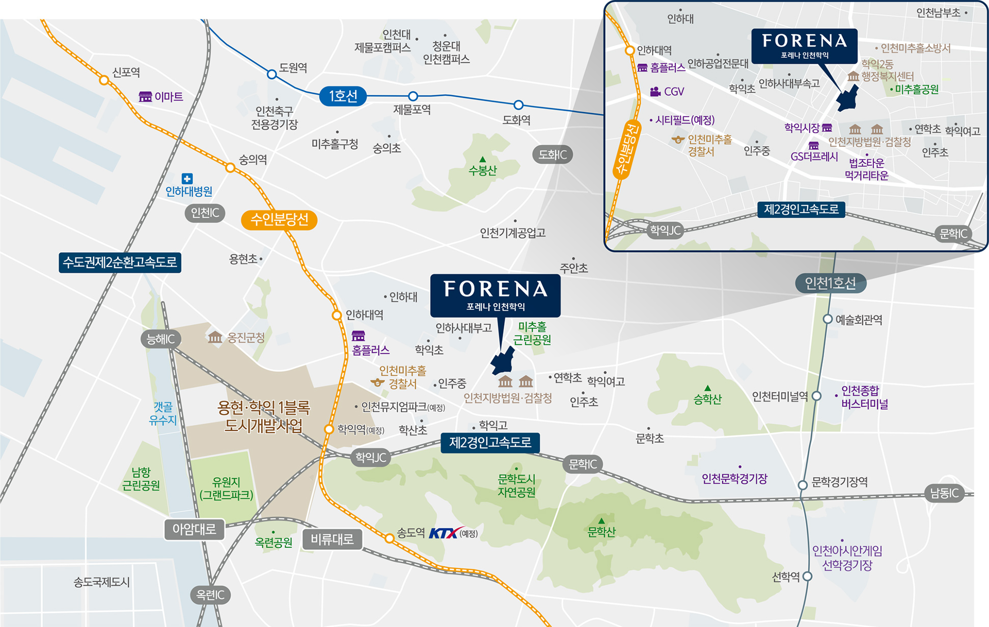 학익지구 원도심에 있는 포레나 인천학익은 교통·교육·생활을 모두 잡은 뛰어난 생활 인프라가 좋은 편입니다.