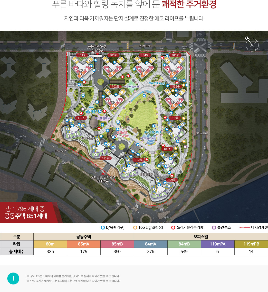 전체 세대수는 1796세대 이고 이중 공동주택은 851세대를 분양합니다.