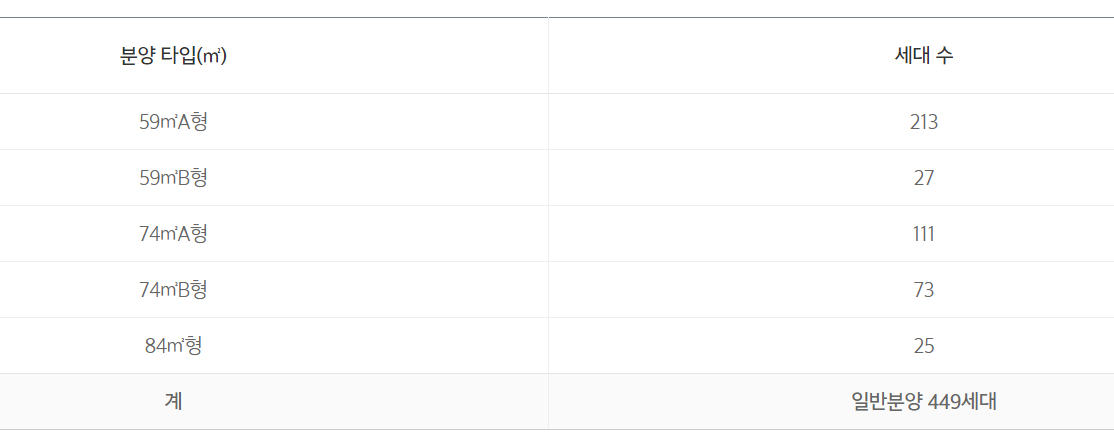 전용면적별 일반분양은 △59㎡A 213세대 △59㎡B 27세대 △74㎡A 111세대 △74㎡B 73세대 △84㎡ 25세대 등으로 수요자들의 선호도가 높은 중소형 평형으로 공급됩니다.