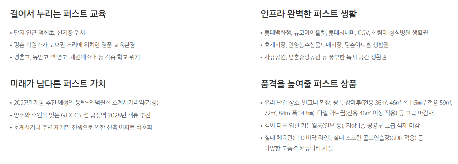 주변생활편의시설로는 평촌아트홀, 롯데백화점, 롯데시네마, 뉴코아아울렛, CGV, 성심병원, 안양시청 등이 가깝고, 단지 앞에 행정복지센터가 건립될 예정입니다.