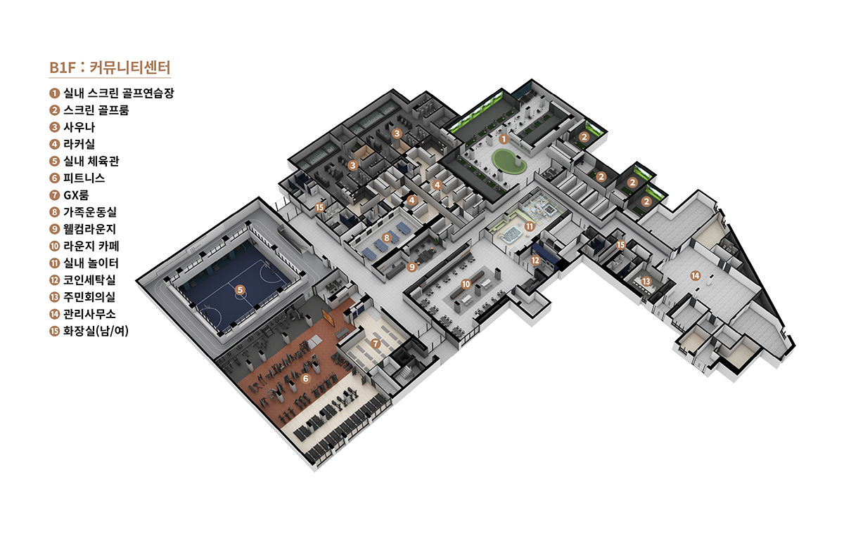 단지 내 실내 체육관은 상부에는 러닝트랙이 설치되고, 농구장, 배드민턴장, 테니스장 등으로 활용이 가능합니다.