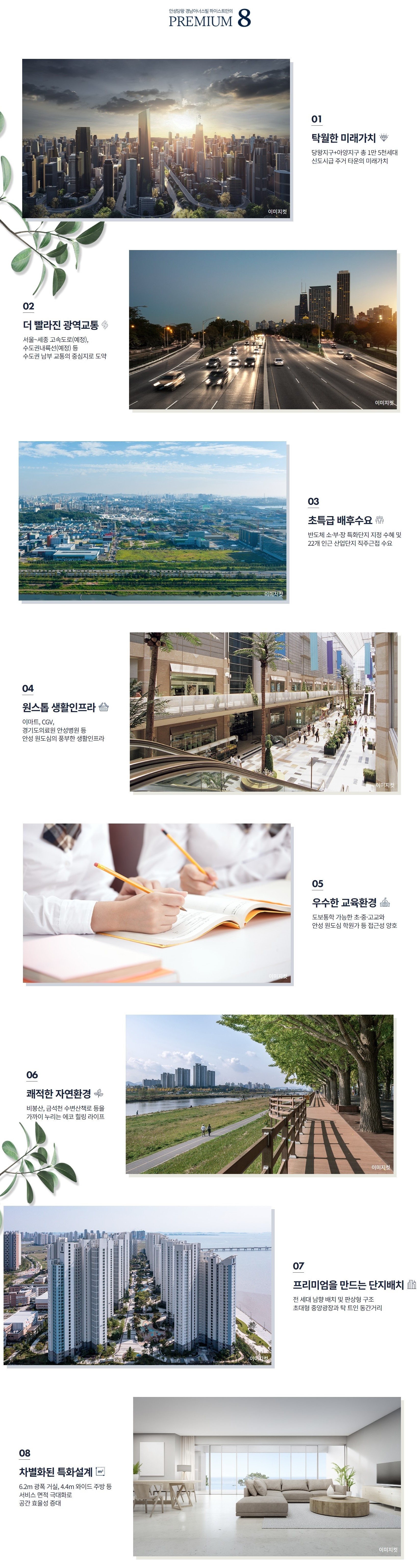 최근 각광 받는 직주근접 단지로서 반도체 소부장 특화단지인 동신일반산업단지(예정)와 인접해 있으며, 첨단산업, 지식산업기업이 입주할 안성테크노밸리(예정)와 안성 제5 일반산업단지(예정) 및 안성 제1, 2, 3, 4 일반산업단지와의 이동도 편리한 편입니다.
