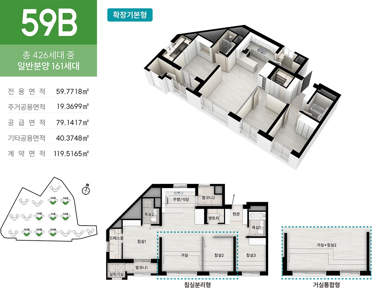 또한 타입별로 복도팬트리, 알파룸, 워크인 드레스룸 등이 도입돼 수납공간과 공간활용성을 높인 점도 중요한 포인트 입니다.
