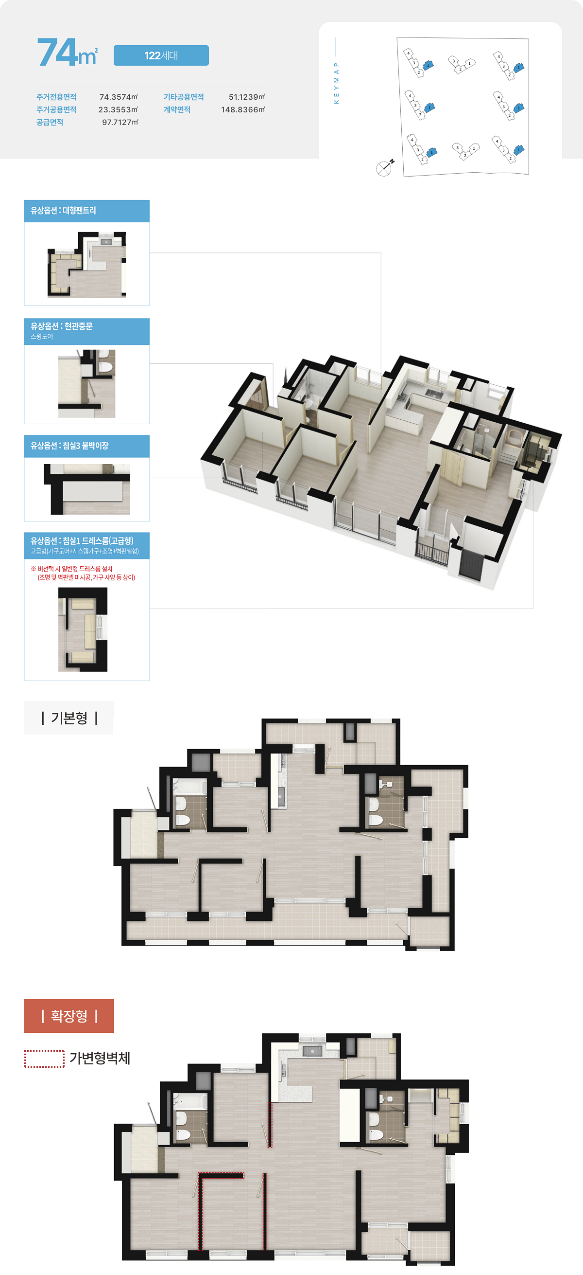 평면도를 살펴보면 다양한 평형과 타입 으로 구성되어 있습니다. 영종도에 거주하는 입주민 분들의 선호도를 고려하여 거의 대부분 중.대형 평형들로 구성되어 있습니다. 아무래도 영종에 거주하는 분들이 공항이나 송도. 청라 등에 직장을 가지신 경우가 대부분이기 때문에 1인 ~ 2인 가구들 보다는 여러명이 거주하는 경우가 많기 때문에 이러한 점을 구성에 반영하였다고 보입니다.