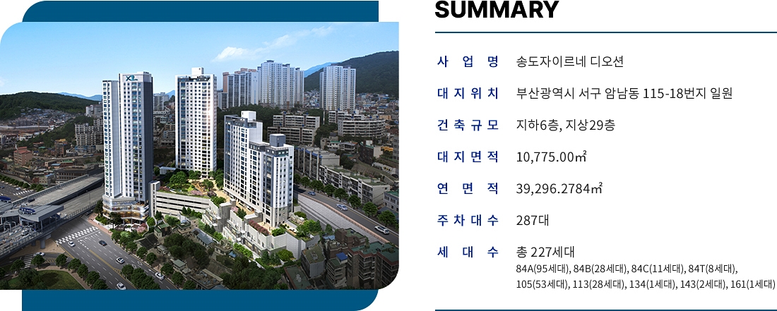 오래간만에 부산에 공급되는 아파트 입니다. 해당 사업지는 부산 서구 암남동에 위치하여 있습니다. 오션뷰는 부산 뿐만이 아니라 전국적으로 아주 많은 사람들이 선호하는데요. 이 사업지는 송도 해수욕장을 도보로 이동할수 있는 거리에 위치하여 있어 편리하게 산책 및 주변 관광 인프라를 이용할수 있는것이 가장 큰 장점입니다. 지하 6층 ~ 지상 29층 높이에 4개동이 들어오고 총 227세대가 공급됩니다. 조합원 물량은 없고 100% 일반분양 공급입니다.